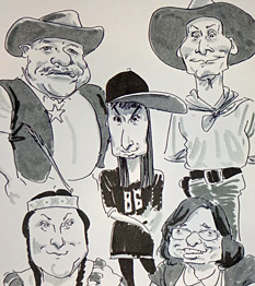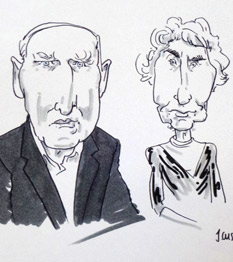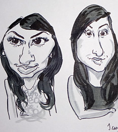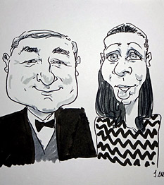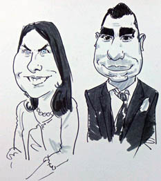 Here are sample caricature drawings from previous events. Notice that each drawing is unique. No two faces look the same! I have drawn live caricatures at weddings, birthday parties, Regimental Summer Balls, summer garden parties and black tie events. A live caricaturist is great entertainment after the wedding breakfast until the disco. Caricatures take around 5 mins and are made directly in ink on heavyweight cartridge paper. I work from an easel, for best results. You can hire the caricaturist for weddings in Birmingham and the West Midlands, Leicester, Derbyshire and the Peak District, Shrewsbury and Shropshire, Warwick, Staffordshire, and maybe further afield. For a wedding quote, please email with dates, timings and location. The price of live caricatures depends on drawing time and travel. The recent work page has a range of caricatures from each event, so do take a look there.
